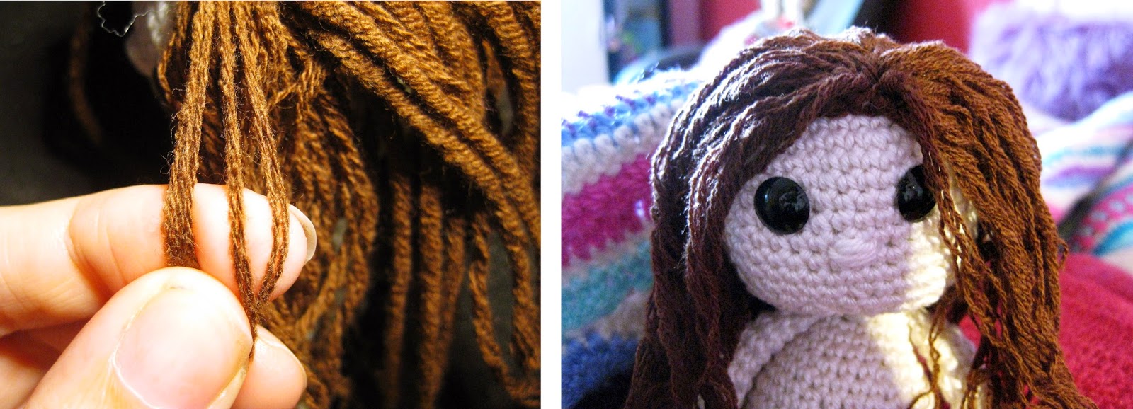 Für die Haare habe ich braune Lisa-Wolle durch die Maschen am Kopf gezogen und die Fäden dann verknotet. Danach hatte ich jeden Faden auseinander gedreht, so dass einzelne „Haare“ entstanden.