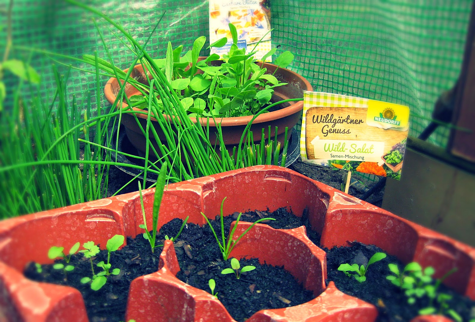 Wie cool mit dem Wildsalat. Ich habe just heute auch ein wenig angepflanzt auf dem Balkon, zweimal Blumen und einmal Klee – die Kaninchen werden sich darüber hoffentlich freuen. Ich habe leider gar keinen grünen Daumen, aber hin und wieder kommt mal was durch und kann verspeist werden. An Salat hab ich mich aber noch nicht rangetraut – außer Rucola, der ist letztes Jahr aber nicht gewachsen.