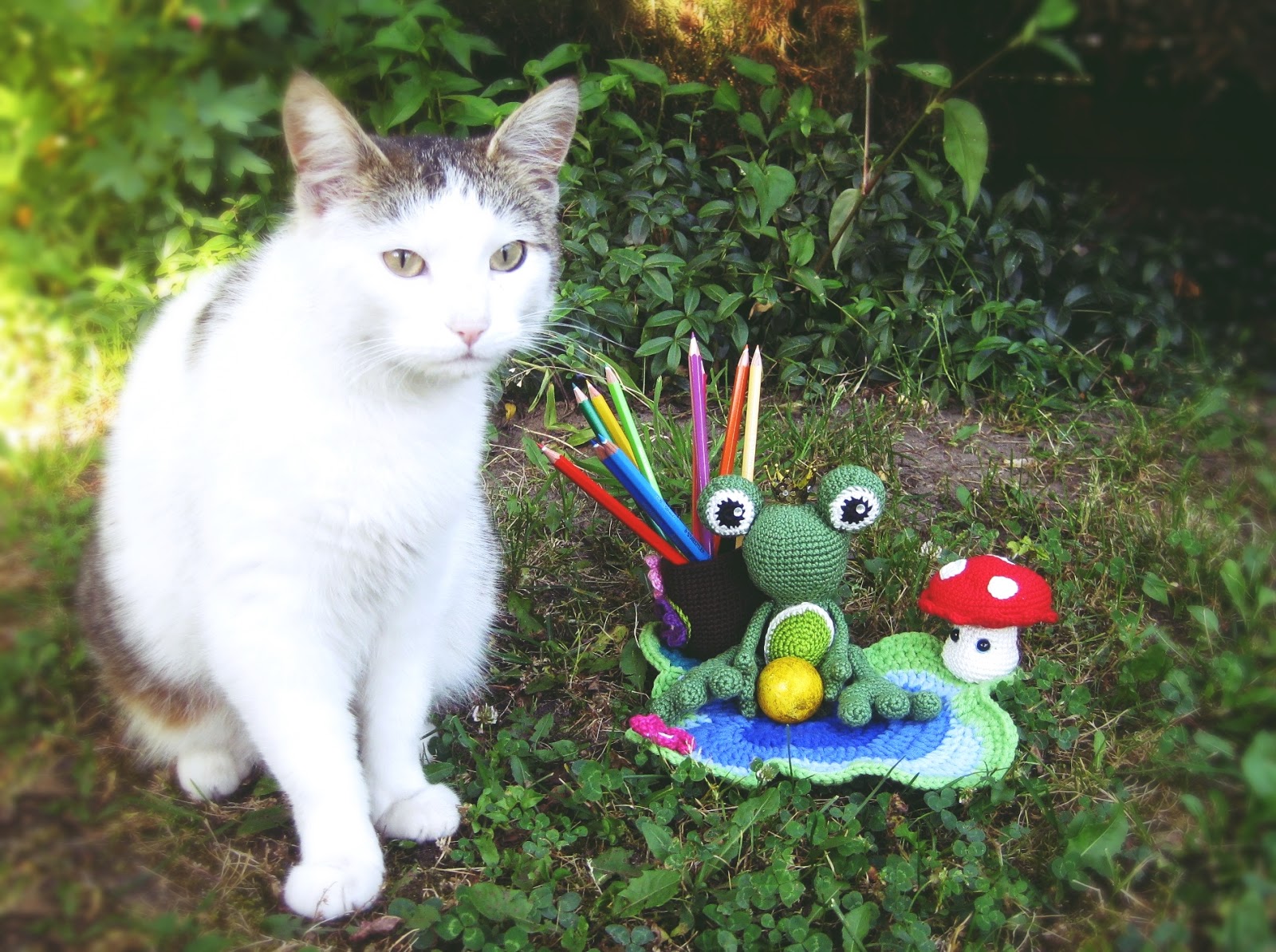 schön dass Ihr wieder vorbeischaut! Heute möchten wir Euch nämlich den allerneuesten Zuwachs in unserer Häkelfamilie vorstellen: Tadaa! Es ist ein Froschkönig! Und er kommt nicht alleine, er bringt auch noch einen kleinen Fliegenpilz, einen Teich und einen hohlen Baumstamm mit! Alles zusammen ergibt das ein Utensilo, das vor kurzem innerhalb eines CAL-Projektes gehäkelt wurde. Organisiert wurde dieser CAL von der lieben Michaela von Angels Design, die sich auch die tolle Häkelanleitung hierzu ausgedacht hat.