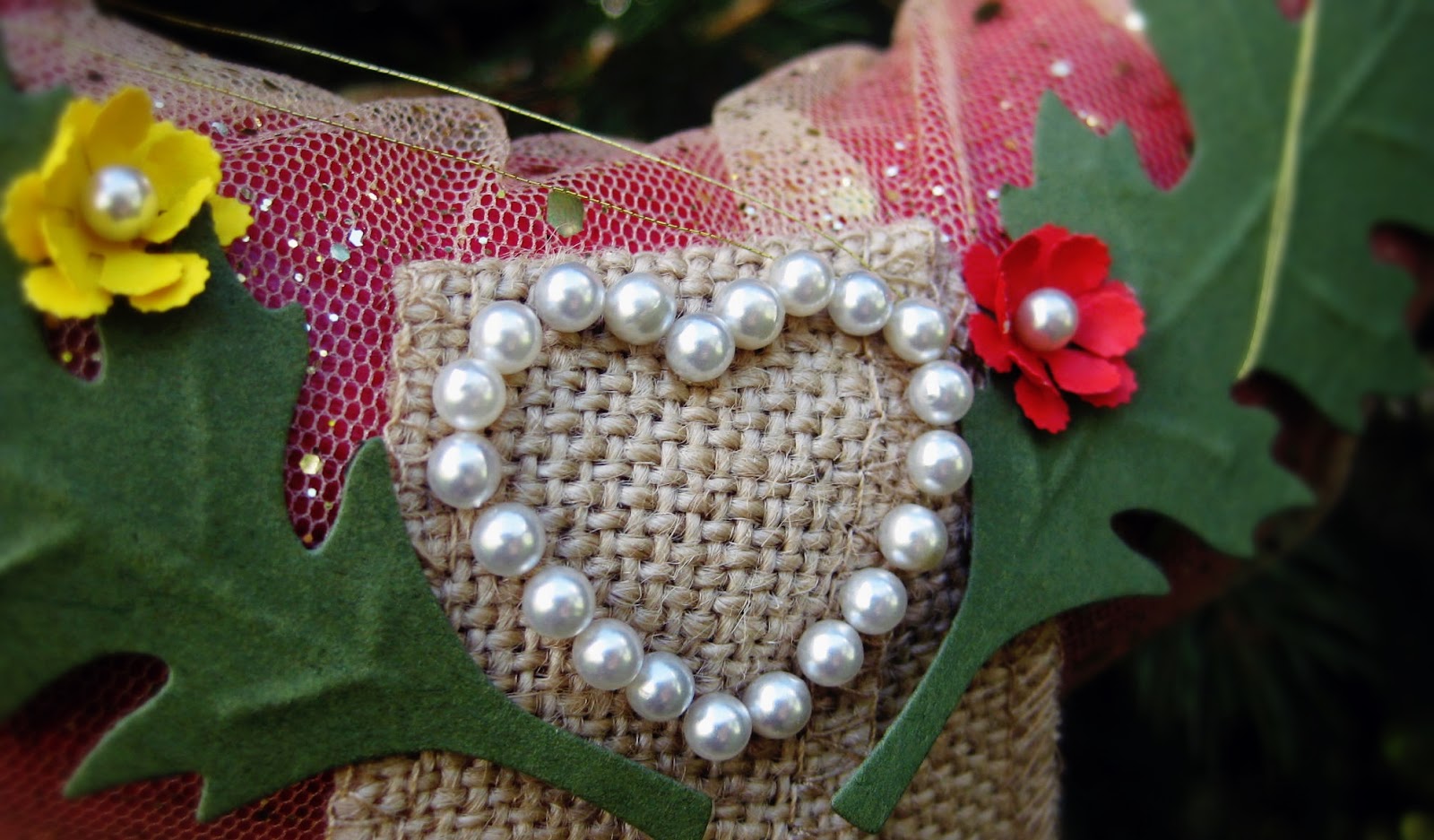 Das mitgeschickte Juteband haben wir mit Stecknadeln auf dem Styroporring befestigt. Die Idee, die Stecknadeln in Form eines Herzens zu stecken, kam uns spontan. Anschließend haben wir die bunten Blätter noch mit unserer Prickelnadel geprägt, so dass man die Blattadern auf der Rückseite erahnen kann.