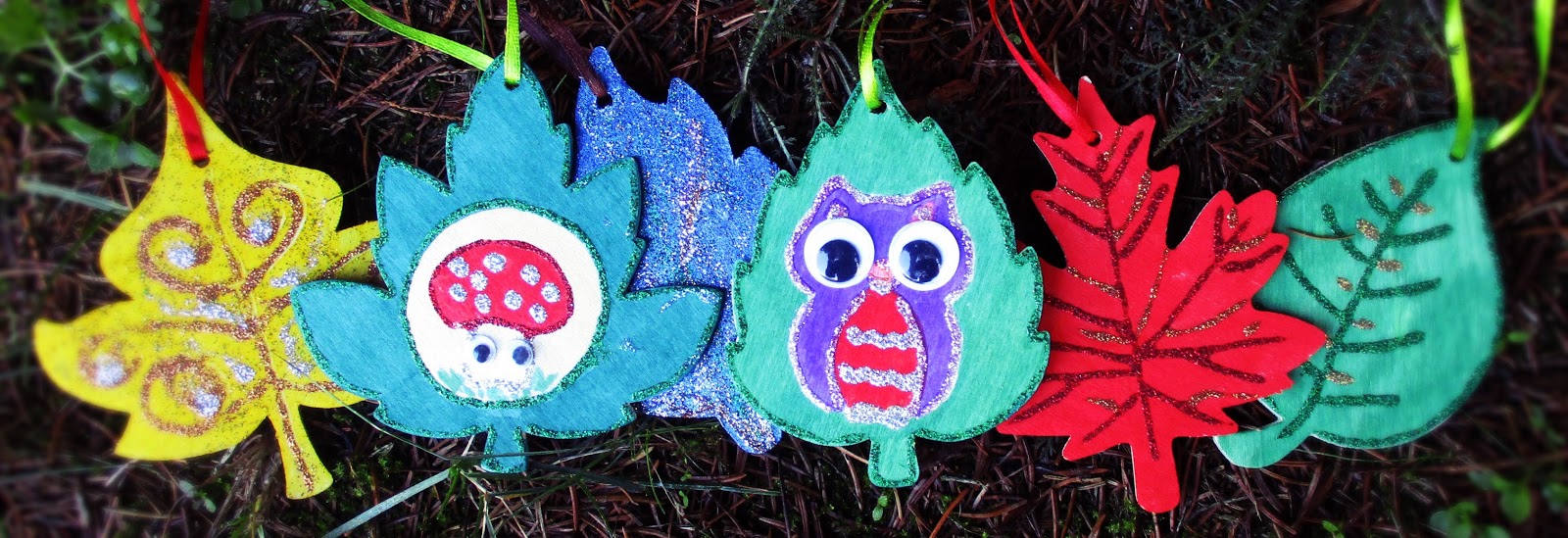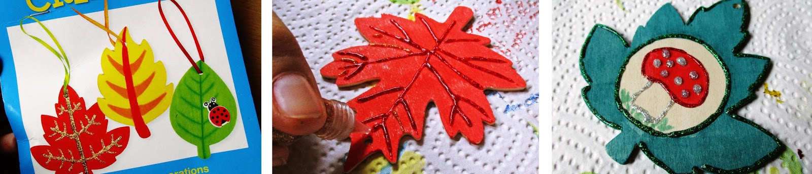 In dem Set gab es 12 verschiedene Blätter, die man gestalten konnte, wie man es wollte. Wir haben dafür verschiedene Farben und Dekosachen benutzt und den Blättern mit Glitzerkleber zum Teil noch Blattadern gemalt! Auch kleine Bilder konnte man darauf gestalten. Bei uns sind eine Eule und ein Fliegenpilz entstanden, die uns mit ihren Wackelaugen anschauen.