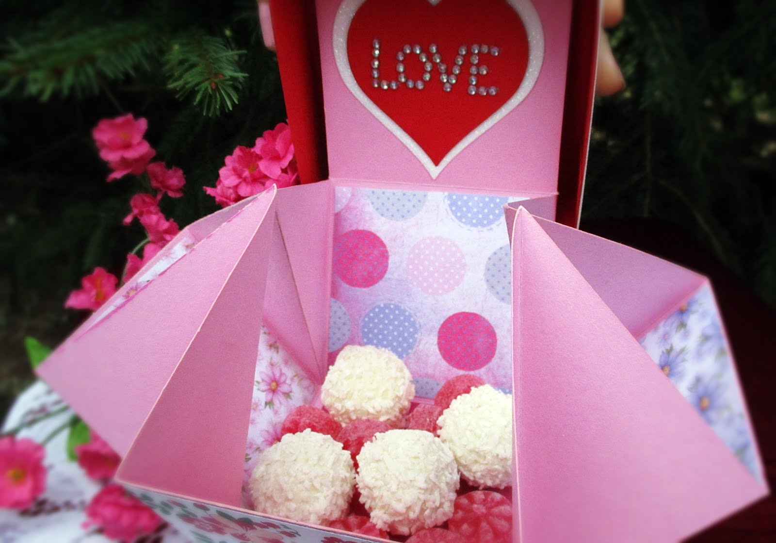 Die Boxkarte ist so gestaltet, dass sich die vier Seiten wie eine Schale öffnen, wenn man den Deckel der Box hochhebt. Ein schöner Effekt, der uns schon beim Basteln neugierig darauf gemacht hatte. Der Deckel ist an einer Stelle mit der Box verbunden, so dass man ihn nicht vollständig abnehmen kann. Im Deckel kann man eine kleine Botschaft hinterlassen! Wir haben uns dafür selbstklebende Glitzersteinchen genommen und die Box auf Valentinstag getrimmt.