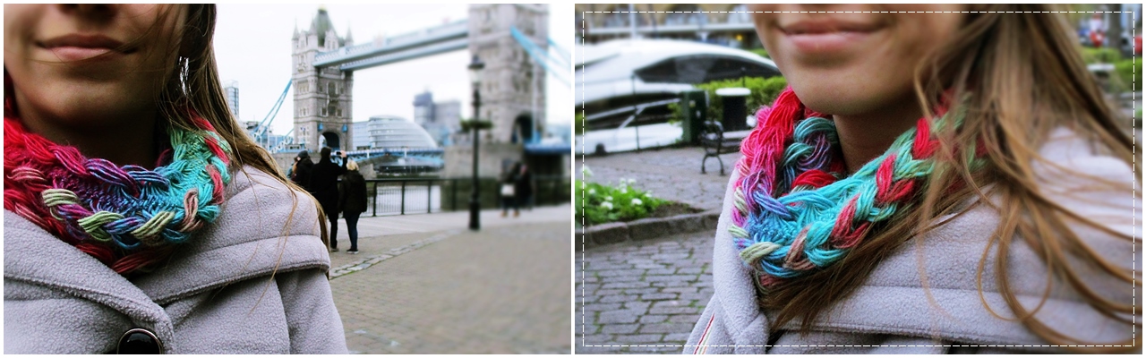 Unser Loop-Schal war rechtzeitig fertig, dass wir ihn Ende Dezember mit nach London nehmen konnten. Da es dort zu der Zeit aber gar nicht so kalt war, sind nur wenige Fotos mit dem Schal entstanden. Hier sehr Ihr Aimee zum Beispiel an der Tower Bridge: