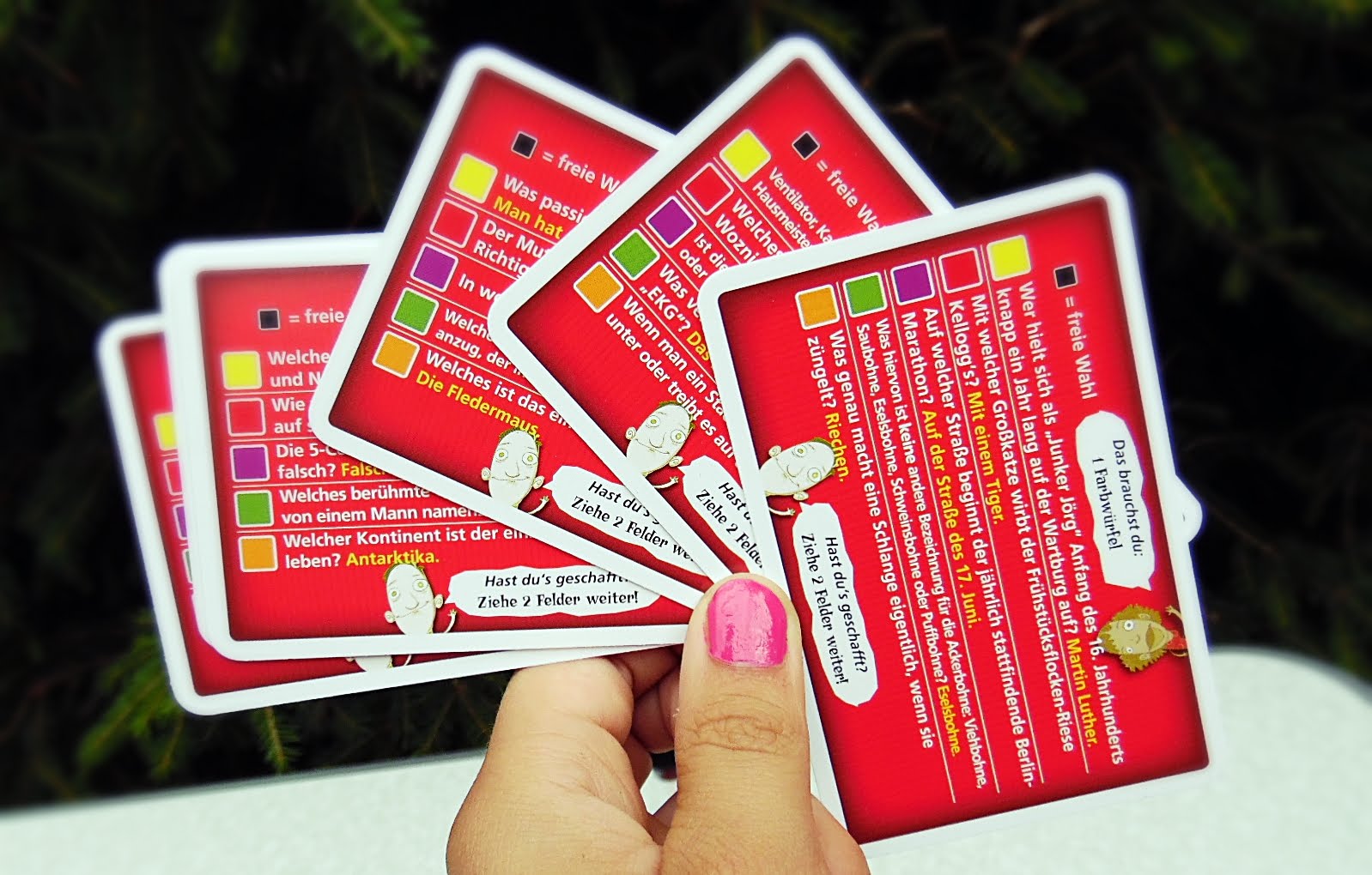 Auf dem Weg ins Ziel kreuzt man früher oder später auch das rote Spielfeld! Nun wird es ernst, denn nun ist Allgemeinwissen gefragt! Die roten Karten werden von einem Mitspieler aufgedeckt und der Farbwürfel entscheidet, welche Frage man auf dieser Karte beantworten muss. Wenn man beispielsweise weiß, wer sich als „Junker Jörg“ im Mittelalter auf der Wartburg aufhielt, kann man hier 2 Felder weiter ziehen!