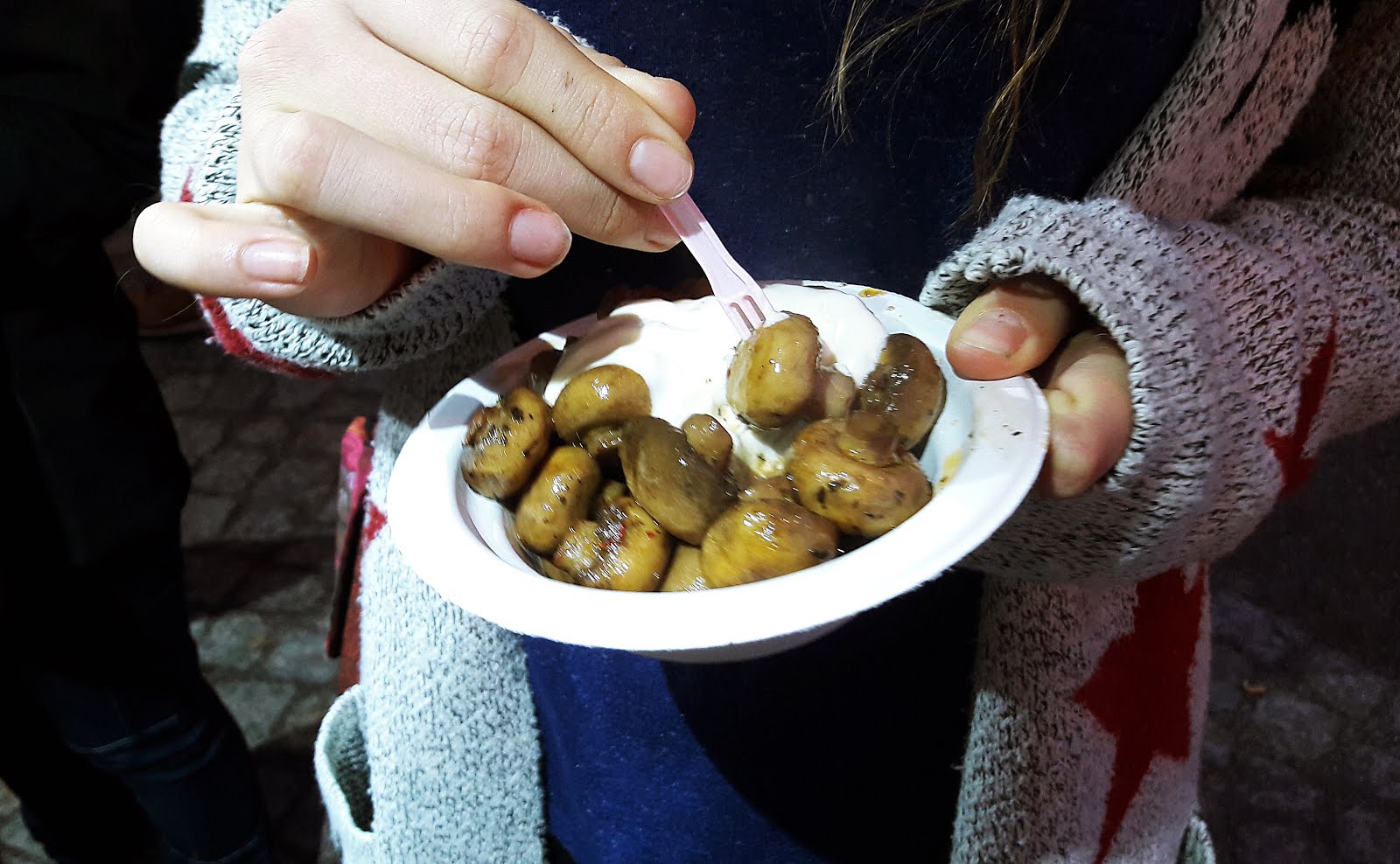 Zwischen diesem und dem nächsten Arzttermin blieb eine knappe Stunde Zeit, durch dieStadt zu bummeln, ins Einkaufszentrum zu gehen und sogar noch ein wenig Zeit, einige Minuten auf dem Weihnachtsmarkt zu verbringen. Wie immer konnten wir dort unserer heißgeliebten Champignonpfanne nicht widerstehen.