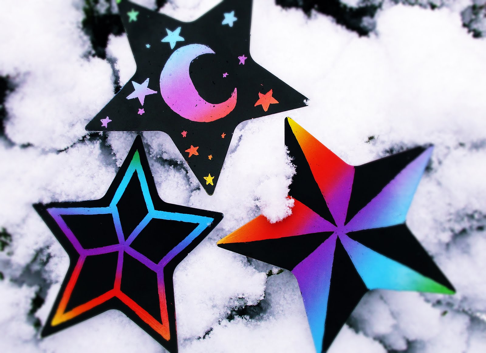 Kratzbilder sind bei den Mädels sehr beliebt! In allen Formen und Regenbogenfarben. Dieses Set enthielt 10 Sterne, die man mithilfe des Kratzwerkzeugs mit verschiedendsten Mustern verzieren kann. Insgesamt gibt es 10 Kratzwerkzeuge und ausreichend viele Magnete, die nach der Gestaltung auf der Rückseite befestigt werden können. Da uns die Beispiele auf der Verpackung so gut gefielen, haben wir ein paar davon nachgezeichnet.