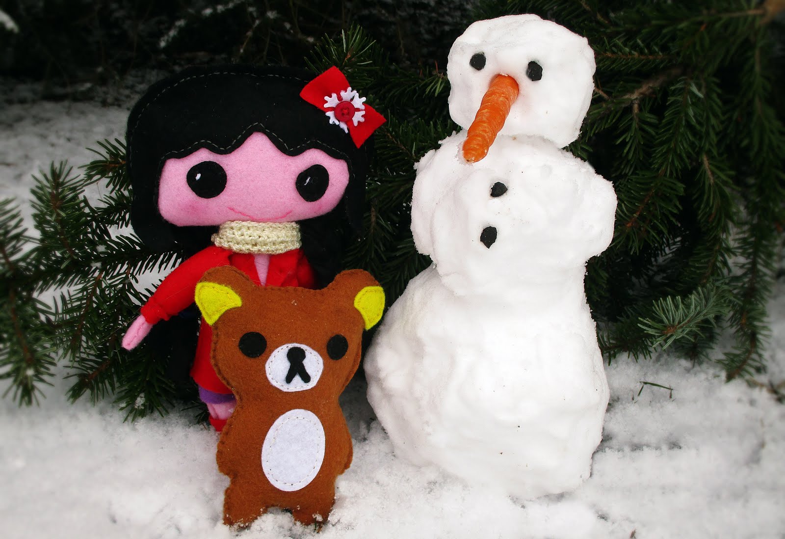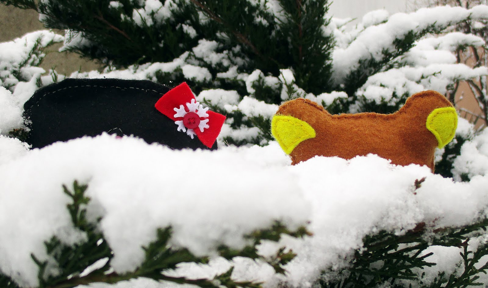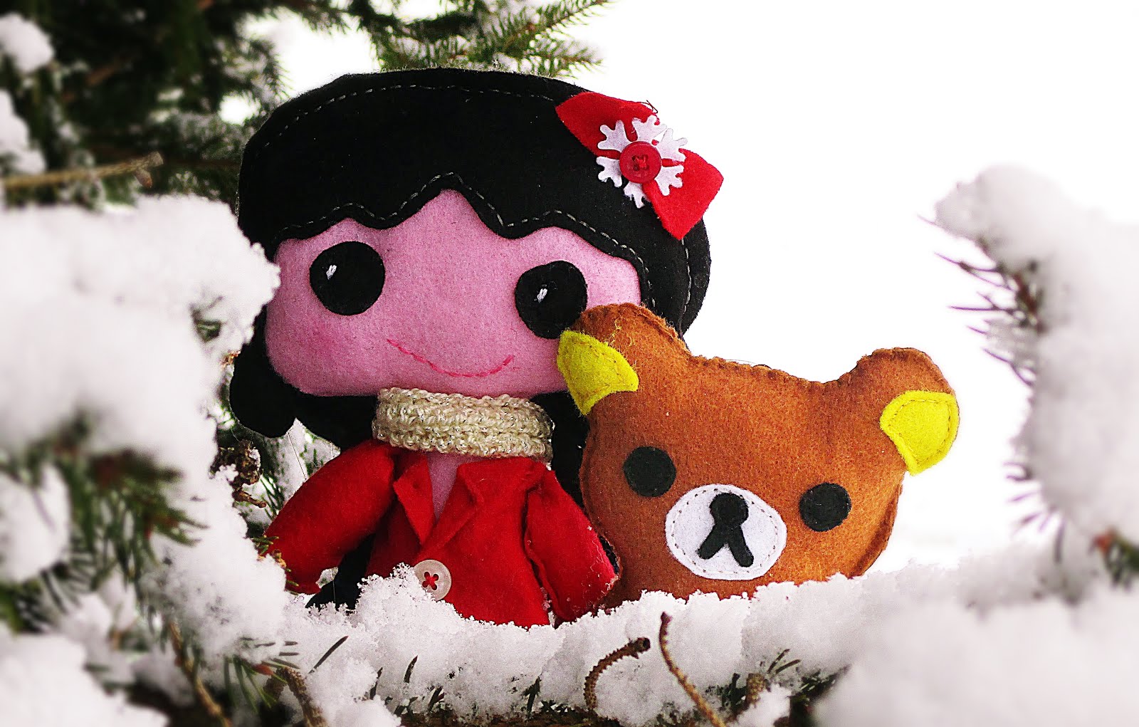 Nun ist das Geheimnis gelüftet. Die kleinen Figurchen, die auf dem Foto nur mit den Köpfchen aus dem verschneiten Bäumchen herausragten, sind ein Teddybärchen und ein kleines Püppchen mit langen schwarzen Zöpfen und einem Schleifchen im Haar. Die beiden sind mittlerweile etwas mehr als zwei Wochen alt und ganz aus Filz entstanden.