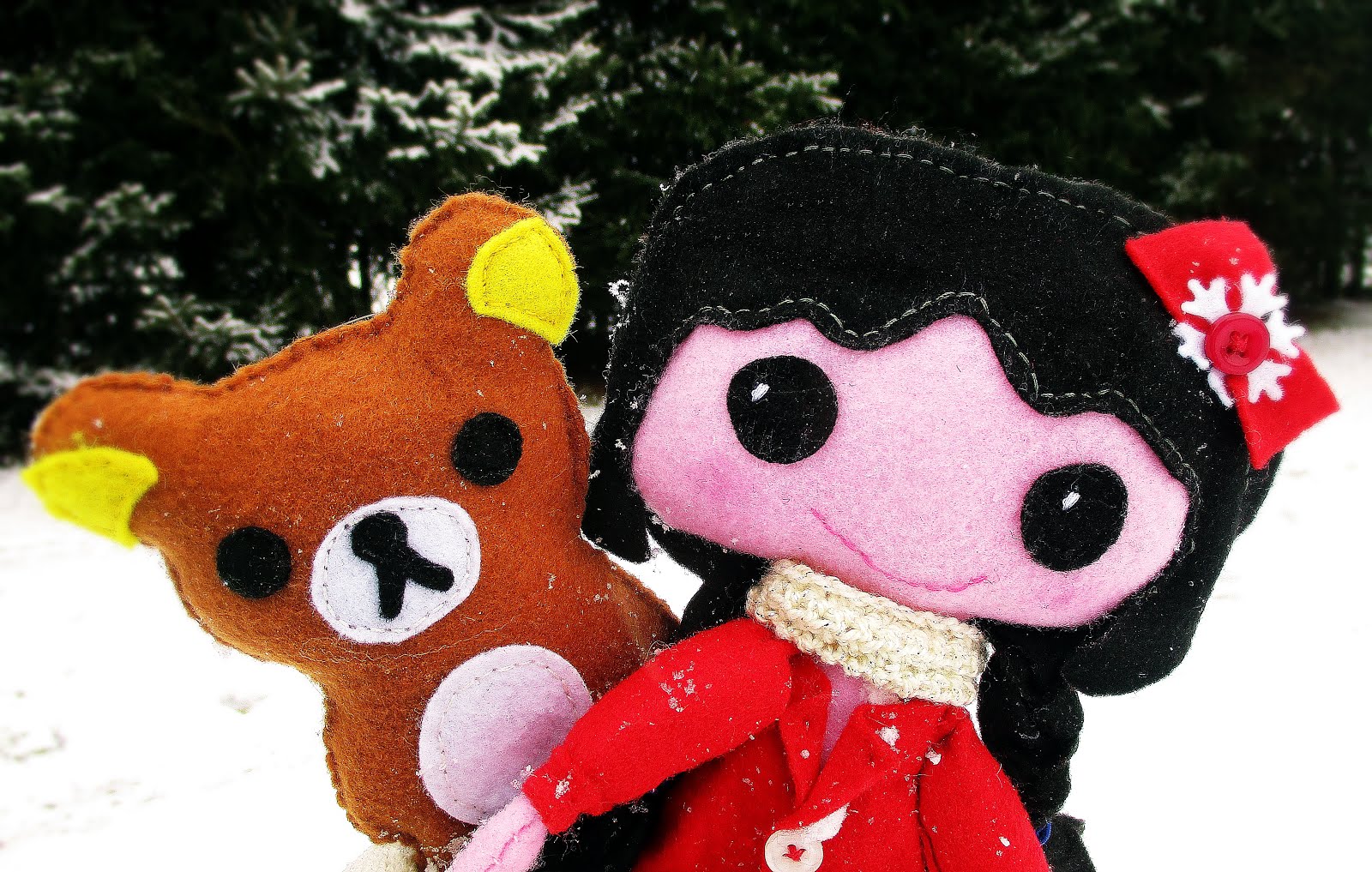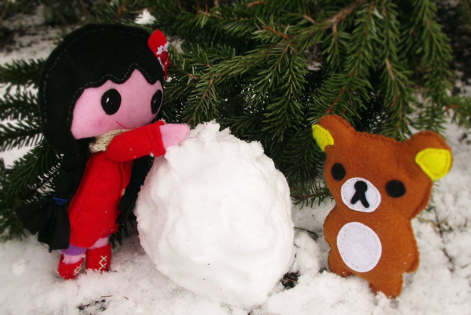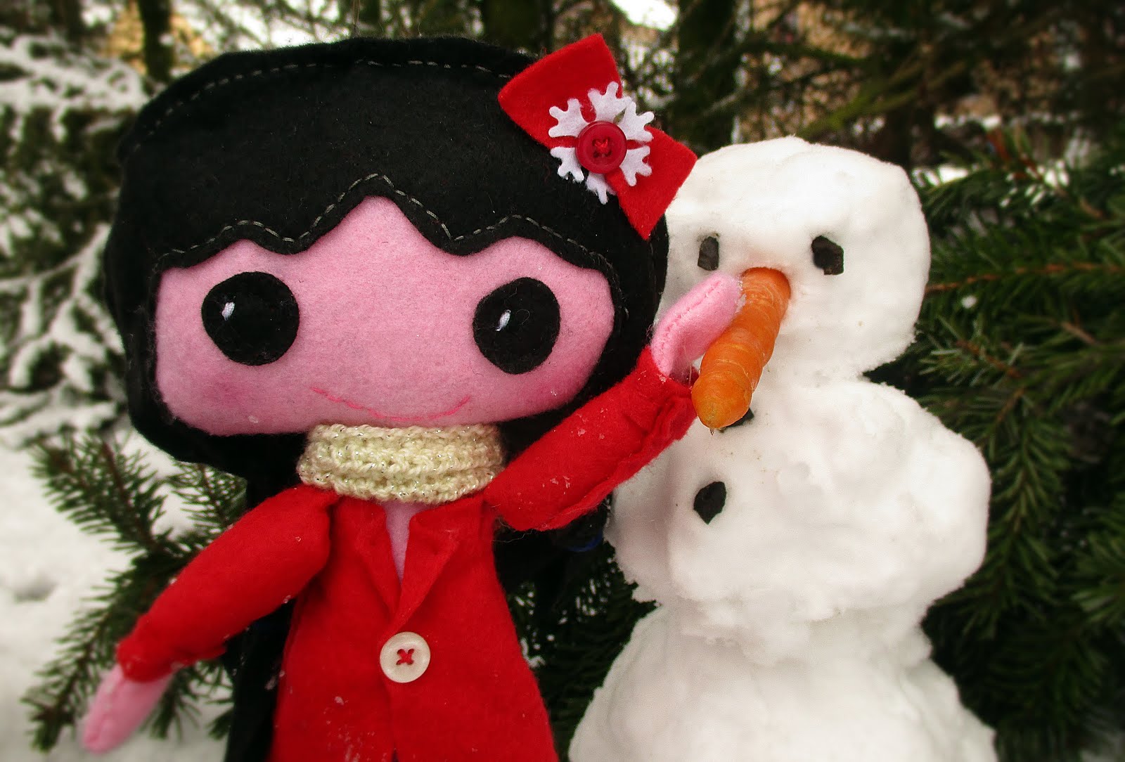 Nun ist das Geheimnis gelüftet. Die kleinen Figurchen, die auf dem Foto nur mit den Köpfchen aus dem verschneiten Bäumchen herausragten, sind ein Teddybärchen und ein kleines Püppchen mit langen schwarzen Zöpfen und einem Schleifchen im Haar. Die beiden sind mittlerweile etwas mehr als zwei Wochen alt und ganz aus Filz entstanden.