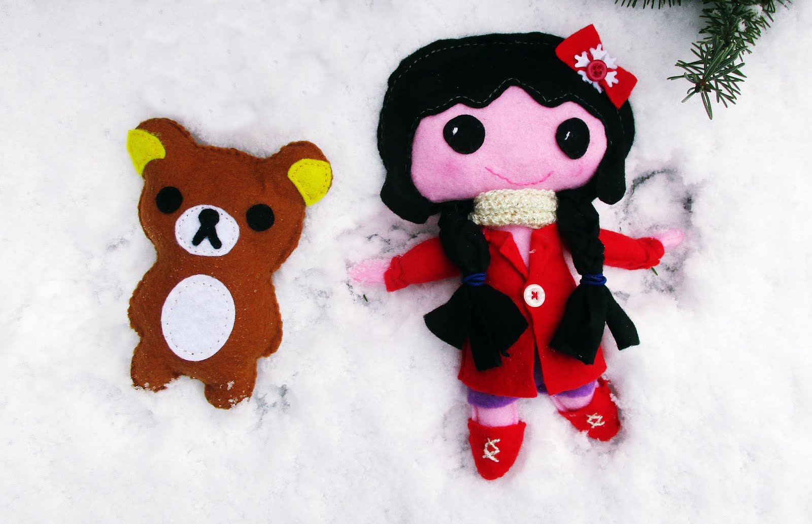 Inspiriert wurden wir zuvor im Internet … tippt man bei einer bekannten Suchmaschine die Suchbegriffe „felt“ und „doll“ ein (auf Englisch ist man meist erfolgreicher) … findet man die schönsten Kreationen! Eine niedlicher als die andere! Auch Aimees Teddy entstammt einer solchen Inspiration! Vielleicht kommt er einigen von Euch sogar bekannt vor, denn Aimee wollte unbedingt einen „Rilakkuma“ – einen in Japan sehr bekannten Teddybär – nähen. Und ich finde, er ist ihr sehr gut gelungen … nicht wahr?