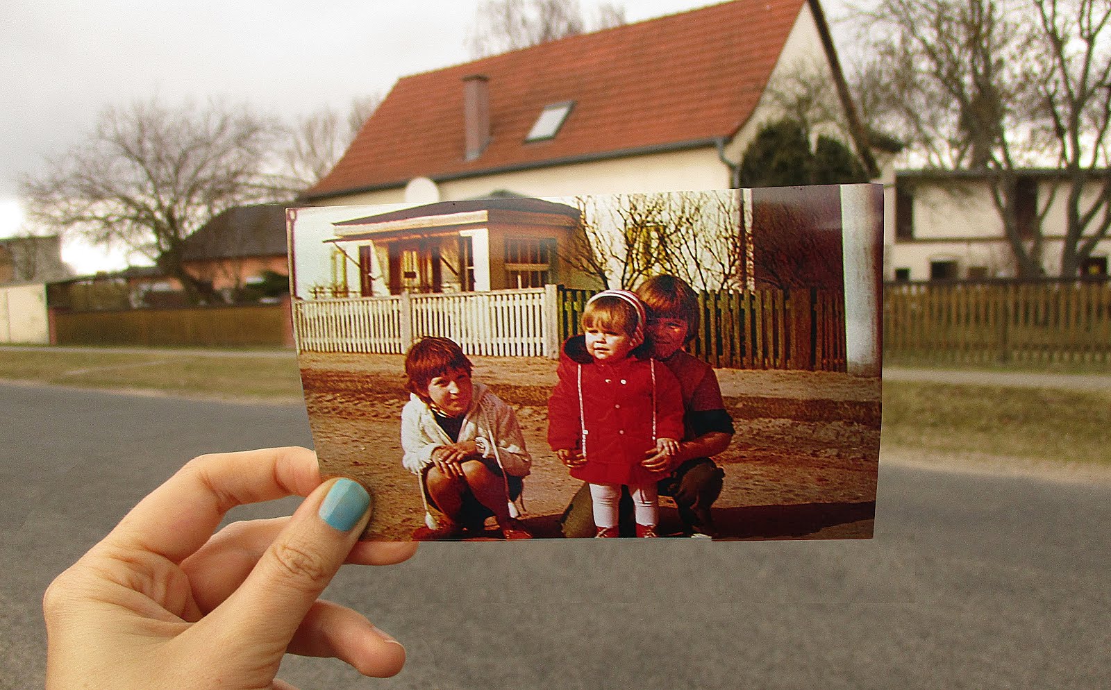 Sucht Euch ein oder mehrere Fotos aus Eurer Kindheit, von denen Ihr wisst, an welchen Orten diese Fotos damals aufgenommen wurde. Besucht diesen Ort, schwelgt in Erinnerungen und haltet das Foto so in die Kamera, dass der Hintergrund der Gegenwart mit den Winkeln und Ecken auf dem Kindheitsfoto annähernd überein stimmen. Im besten Fall ist Eure Hand auf dem Foto mit zu sehen, denn so wünscht es sich der Erfinder von „Dear Photograph“ für solche Fotos. Zum Schluss schreibt Ihr noch ein paar Gedanken zu dem Foto.
