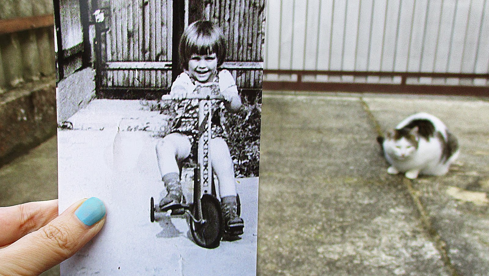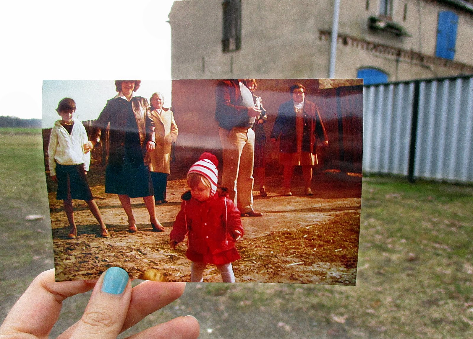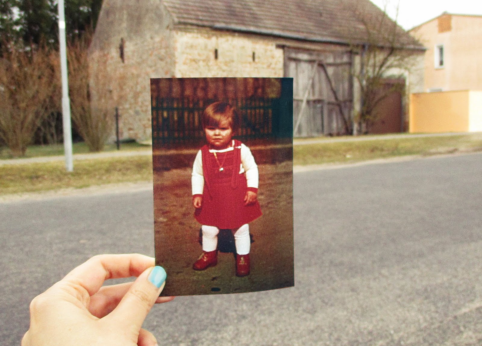 Noch am selben Abend suchte ich in meinen Kinderfotos nach Bildern, bei denen ich genau wusste, wo diese vor vielen vielen Jahren fotografiert wurden. Da ich meine Heimat nicht verlassen habe und auch noch dort wohne, wo ich meine Kindheit verbracht habe, war es für mich nicht schwer, diese Orte aufzusuchen und so machten Aimee und ich uns gestern mit Kamera und Regenschirm auf den Weg, meine Kinderfotos im Stil von „Dear Photograph“ zu knipsen! Und dabei dachten wir uns,dass dies doch ein schönes Thema für eine Blogparade wäre, findet Ihr nicht auch?