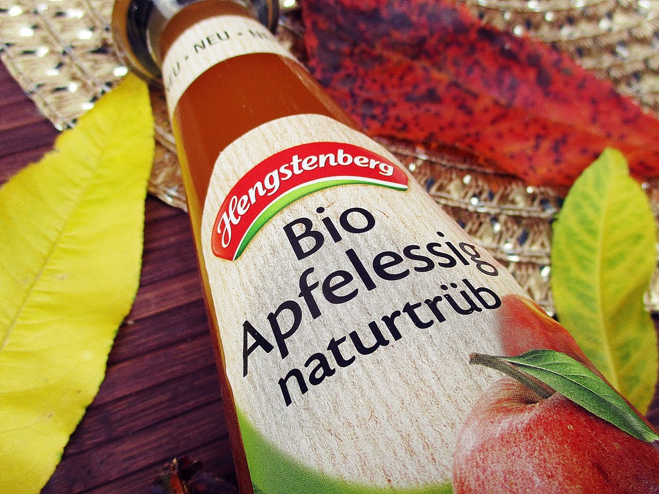 „Hengstenbergs Apfelessig ist der trendige Alleskönner in Bioqualität, Durch seinen vollmundigen und fein-säuerlichen Geschmack eignet er sich zum Marinieren von Fleisch oder zum Zubereiten von Salatdressings. Da der Essig nach dem Pressen der enthaltenen Äpfel nicht filtriert wird, erhält er seine natürliche Trübung.“