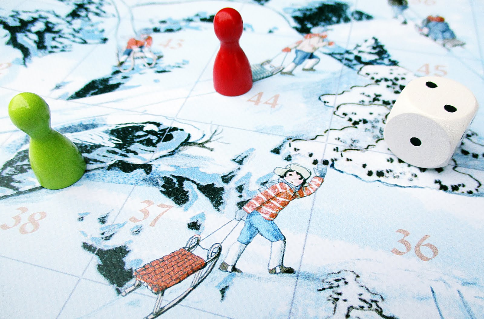 … denn unterwegs kann es schnell von einer Sekunde auf die andere zu einer spannenden Kletter- oder aber Rutschpartie kommen! Passend zum Thema „Schlittenfahrt“ wimmelt es auf dem Spielplan nämlich von fröhlichen Kindern mit Schlitten und Skiern, die entweder gerade den Berg herunter rodeln oder ihren Schlitten wieder hinauf ziehen. Landet man auf solch einem Feld, muss man als Spieler den entsprechenden Schlittenspuren folgen …