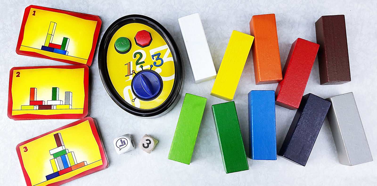 Zum einen gibt es in der Neuauflage wieder 80 doppelseitig bedruckte Baukarten, die je nach Schwiergkeitsstufe mehr oder weniger bunte Bausteine erfordern. Zum anderen findet man darin zwei Würfel, die entweder darüber entscheiden, wie viel Zeit dem Spieler fürs Bauen vergönnt ist oder in welcher Fun-Spielvariante gespielt werden darf. Besonders „lustig“ wird es für den aktuellen Spieler aber dann, wenn die ablaufende Zeit geheim eingestellt wird, und er nicht ahnt, wie viel Zeit ihm noch fürs Konstruieren bleibt … Ziemlich fies oder?