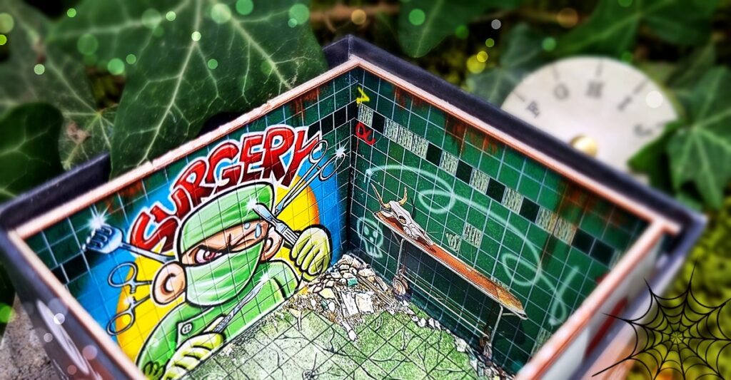 Denn kurz nachdem ich den Deckel vom ersten Cube namens OP-Raum öffnete, „stand“ ich auch schon im Operationssaal eines verlassenen Gebäudes einer ehemaligen Heilanstalt, in dem es nur so vor modernen Graffiti-Kunstwerken und Schmierereien wimmelte! Mein erster Gedanke: Wow, hier stehen ja sogar noch alte Geräte rum! Doch kaum wollte ich sie mir näher anschauen, fiel auch schon die einzige Tür zur Außenwelt ins Schloss und kein Versuch, sie zu öffnen, gelang! „Hör auf zu rütteln!“ hörte ich kurz darauf eine junge Männerstimme von draußen rufen!