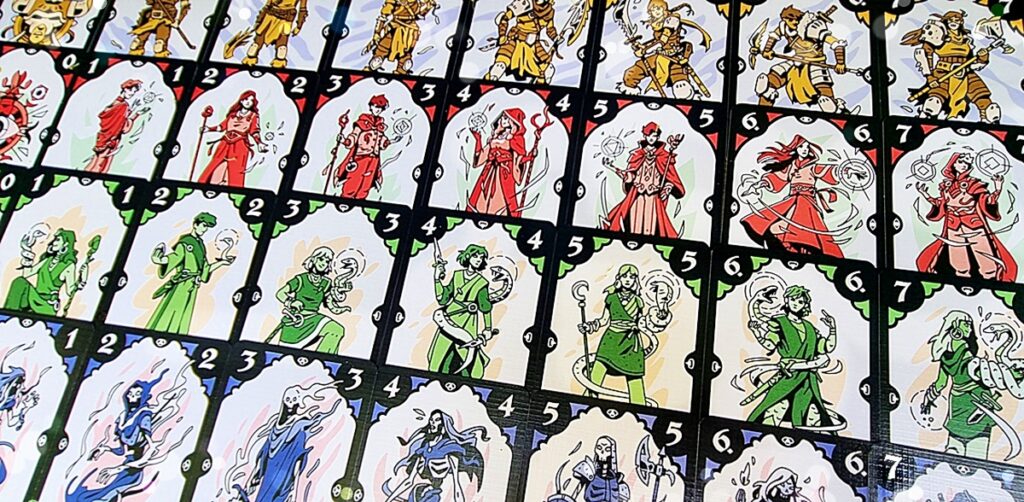 … in unserem Fall ist das das Grüppchen aus Geist und Sensenmännchen! Danach sind alle anderen Spieler im Uhrzeigersinn an der Reihe und müssen versuchen, deren ausgespielte Farbe zu bedienen. Wer keine passende Karte auf der Hand hat, darf eine andere Farbe oder eine Karte in der Trumpffarbe Rot spielen. Den Stich gewinnt der höchste Zahlenwert in der geforderten Farbe (im oberen Bildbeispiel die 11) – außer, jemand hat Rot gespielt, denn Rot sticht immer! Der Gewinner des Stichs darf sich dann die für ihn wertvollste Karte aus dem Stich nehmen und sie zu seinen – hoffentlich noch reichlich hinzukommenden – Punkten legen. Wenn alle Karten ausgespielt sind, wird abgerechnet: Wer seine Vorhersage – also die Summe der zuvor gewonnenen Stichpunkte – richtig getroffen hat, bekommt Erfahrungspunkte. Und wer davon am meisten sammeln konnte, gewinnt das Spiel! „So einfach ist das?“ Ja, Teddy!