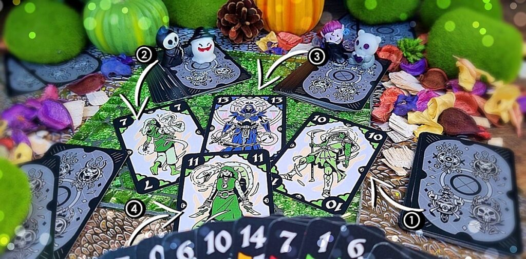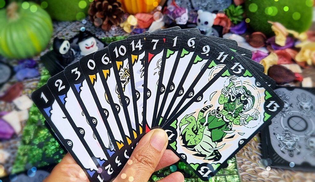 Oh, diese Frage kommt ja wie gerufen, Vampirchen! Pass auf, ich erklär’s dir und unseren Lesern ganz kurz: Nachdem alle Karten unter allen Mitspielern verteilt wurden, schaut Ihr Euch Eure Handkarten genau an und überlegt, wie viele Punkte Ihr in dieser Runde holen könntet. Wählt dann zwei Zahlenwerte aus dieser Auswahl aus und legt sie verdeckt vor Euch ab – das ist Eure geheime Vorhersage! Beispiel gefällig?