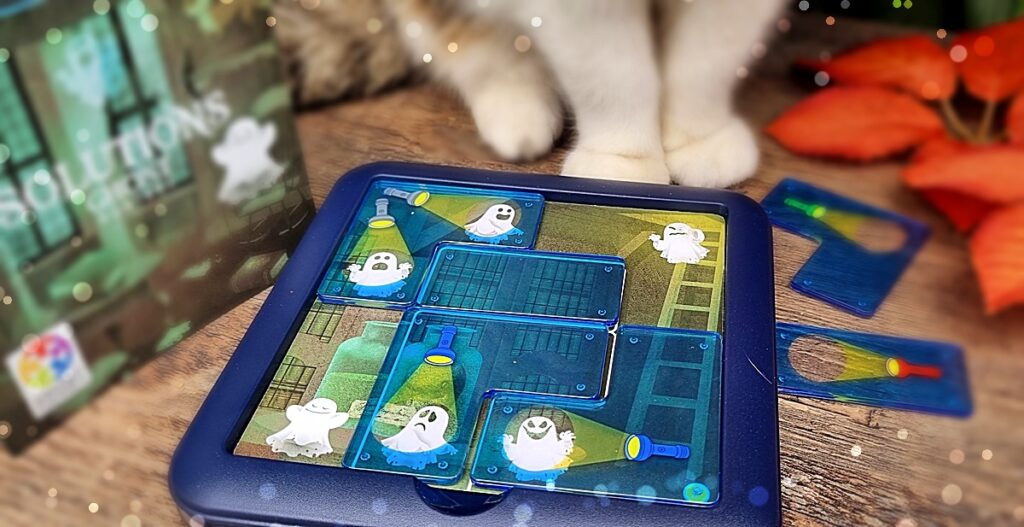 Und so funktioniert’s: Auf dem Spielfeld verstecken sich sechs kleine Geister – und Eure Aufgabe ist es, sie alle mit einer Taschenlampe anzustrahlen. Klingt einfach? Ist es aber gar nicht! Denn Ihr müsst die durchsichtigen Puzzleteile so auf der Aufgabenkarte platzieren, dass wirklich jeder Geist getroffen wird. Anfangs helfen noch einige Linien, später seid Ihr auf Euch allein gestellt! Da ist logisches Denken und ein gutes Auge gefragt! Wenn schließlich alle Geister im Licht erscheinen, fühlt sich das fast so an, als hätte man selbst ein kleines Spukgeheimnis gelüftet.