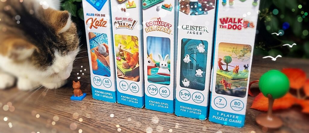 sagt mal, findet Ihr nicht auch, dass der November wie gemacht zum Knobeln ist? Gerade an den trüben Tagen, wenn die Sonne mal wieder Urlaub macht oder sich viel zu früh vom Tag verabschiedet, kuschele ich mich gern in meine kuscheligste Kuscheldecke und greife zu meinen SMART GAMES, die in den letzten Jahren nach und nach ihren Platz in meinem Spieleschrank gefunden haben – das letzte sogar erst vor ein paar Tagen! Und ich verrate Euch auch gern warum: Für mich sind diese analogen Grübelspiele eine willkommene Abwechslung zu meinem Smartphone, an dem ich – zugegebenermaßen – viel zu oft klebe! Ach, Ihr auch? Na, dann wird’s aber höchste Zeit für ein bisschen Digital Detox! Denn glaubt mir, es tut soooooooo gut, mal das Handy außer Reichweite zu legen, es sich auf dem Sofa mit dem Lieblingstier oder den Kindern gemütlich zu machen und sich ganz auf die kleinen, kniffligen Aufgaben zu konzentrieren, von denen es in jedem dieser Spielekartons mindestens 60 an der Zahl gibt! Und diese Aufgaben haben es auch noch in sich: Denn sie trainieren nicht nur Euer Köpfchen, sondern fördern auch so wichtige Fähigkeiten wie das räumliche und logische Denken, Problemlösung und Konzentration. Und das alles auf allerliebste Weise … aber seht am besten mal selbst: