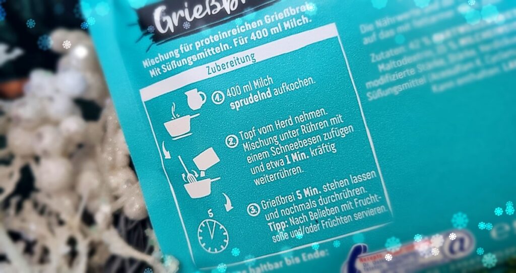 Haha, wer hätt’s gedacht: Ich habe mal wieder keine Milch zuhause! Aber ich bin gespannt, ob der Grießbrei noch genauso schmeckt wie vor drei Jahren – da hatte ich ihn nämlich schon mal in der Box, allerdings noch mit anderem Verpackungsdesign! Übrigens was Ihr nicht seht, ich aber direkt vor mir: Der Inhalt dieses Tütchens hat ein A auf dem Nutri-Score! Na, wenn das mal kein großer Pluspunkt ist.
