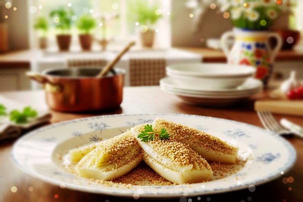 Bleiben wir beim Thema Essen und kommen wir zu einem Gemüse, das ich schon seit Kindertagen sehr gern auf meinem Teller sehe: Chicorée. Und ich rede jetzt nicht von diesem Chicoréesalat mit Mandarinen und Äpfeln – der war nie meine Welt. Ich kenne und liebe dieses Gemüse gekocht, am allerliebsten mit goldbraunen Semmelbröseln obendrauf. Genau so kam er nämlich früher regelmäßig bei uns als Beilage auf den Mittagstisch. Und das aus einem ganz einfachen Grund: Mein Opa hatte nämlich ein großes Gewächshaus, in dem jede Menge Chicorée wuchs! Vielleicht schmeckt er mir bis heute genau deshalb so gut – weil mit jedem Bissen auch ein kleines Stück Kindheit und Familiengeschichte mitschwingt.