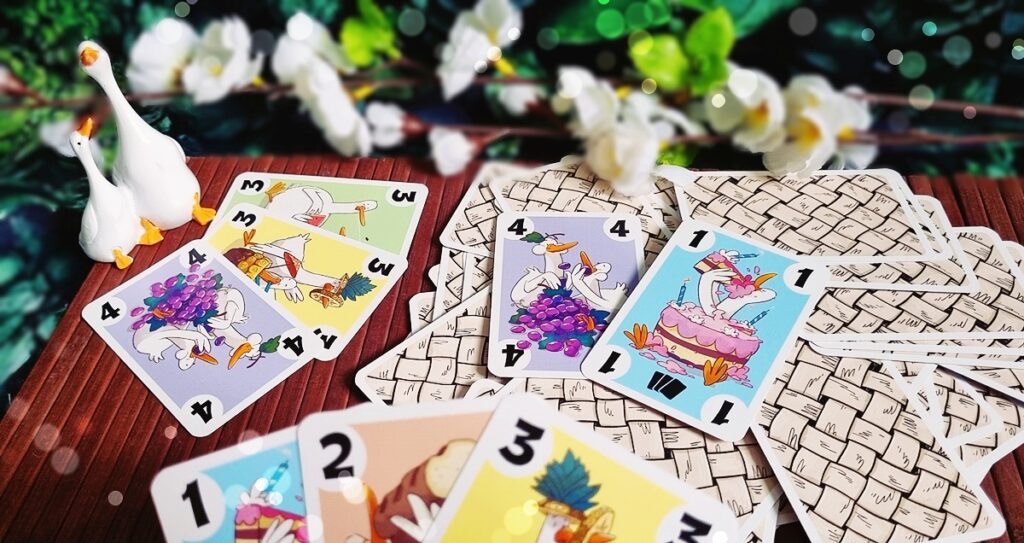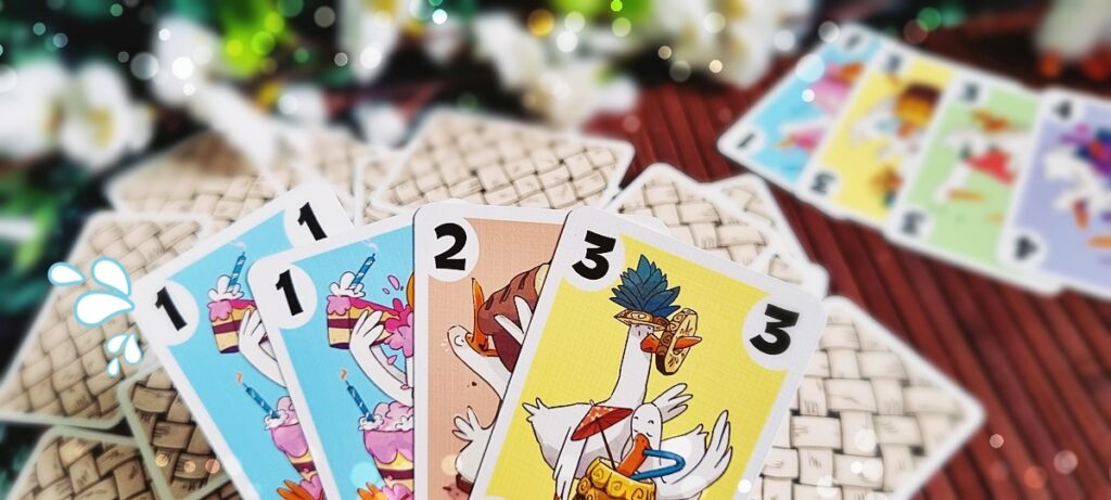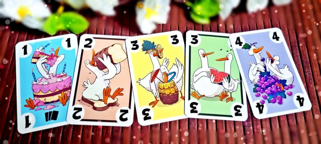 … mischen wir lieber erstmal alle Karten ordentlich durcheinander und platzieren sie auf einem wilden Haufen vor uns, aus dem sich jeder Spieler drei Snackkarten zieht! Mit dieser Basis auf der Hand starten die Spieler, die zuletzt eine Gans gesehen haben (war ja klar, dass das meine Mitspieler sind – sie müssen sich ja nur selbst anschauen), indem sie eine beliebige Karte vom Stapel aufdecken. „Oh, eine 4! Da machen wir doch gleich weiter!“ Und kurz darauf liegt direkt daneben auch schon eine blaue 1er-Karte.