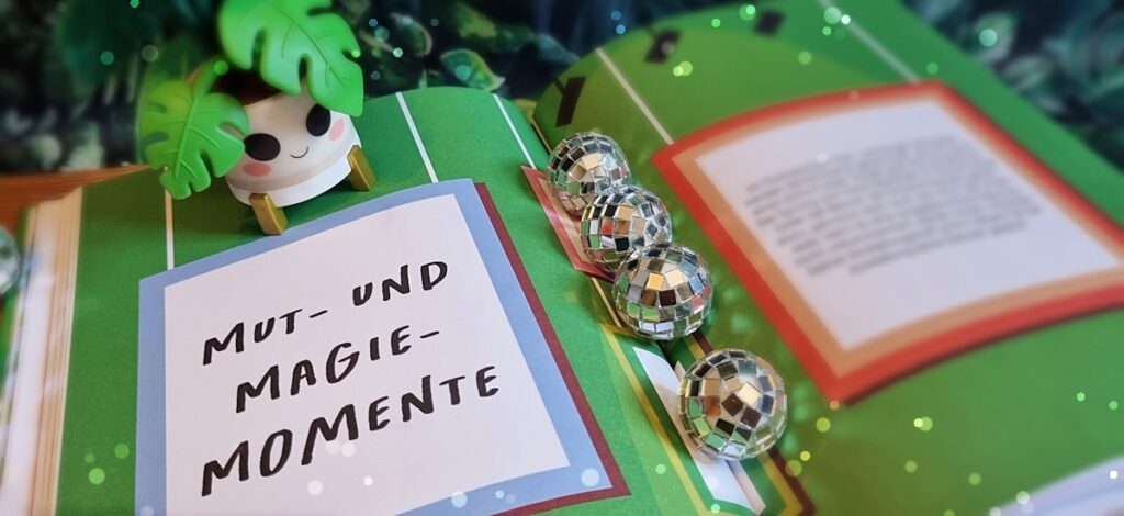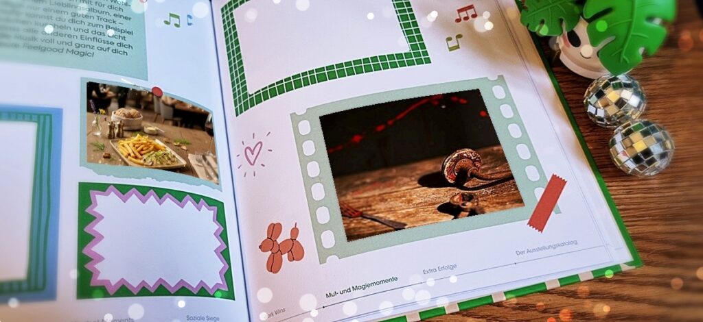 Neben dem oben genannten „Selflove-Spotlights“-Themenraum gibt es im Museum meiner Erfolge noch viele weitere „Räume“, die nur darauf warten, mit handschriftlichen Einträgen, ausgedruckten Erinnerungen oder selbstgemalten Bildern gefüllt zu werden. Zum Beispiel den Raum „Soziale Siege“, der Erfolgsmomente wie das Annehmen von Hilfe, das ehrliche Antworten auf eine (schwierige) Chat-Nachricht oder das bewusste Setzen persönlicher Grenzen kuratiert. Aber es gibt auch reichlich leere Rahmen für die sogenannten „Mindset Moments“ und die „Mut- und Magiemomente“… über die ich erstmal ein Weilchen nachdenken musste …