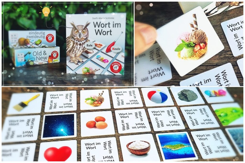 Einige Tage später hieß es mal wieder „Köpfchen anstrengen“, denn im neuen Memospiel von Piatnik müssen nicht einfach nur zwei gleiche Bilder, sondern Wörter im Wort entdeckt werden. So wie „Eis“ in „Reis“ oder „Eule“ in „Keule“. Aber da ich mit dieser simplen Spielregel keinen normal-langen Blogbeitrag füllen konnte, habe ich einfach zwei weitere Spiele dieser Reihe in den Fokus gerückt und gezeigt, wie spielerisch hiermit Sprache trainiert werden kann. Denn all die bunten Kärtchen fördern das Sprachgefühl, die Aufmerksamkeit und auch ein bisschen Kreativität! Aber schaut am besten nochmal selbst: