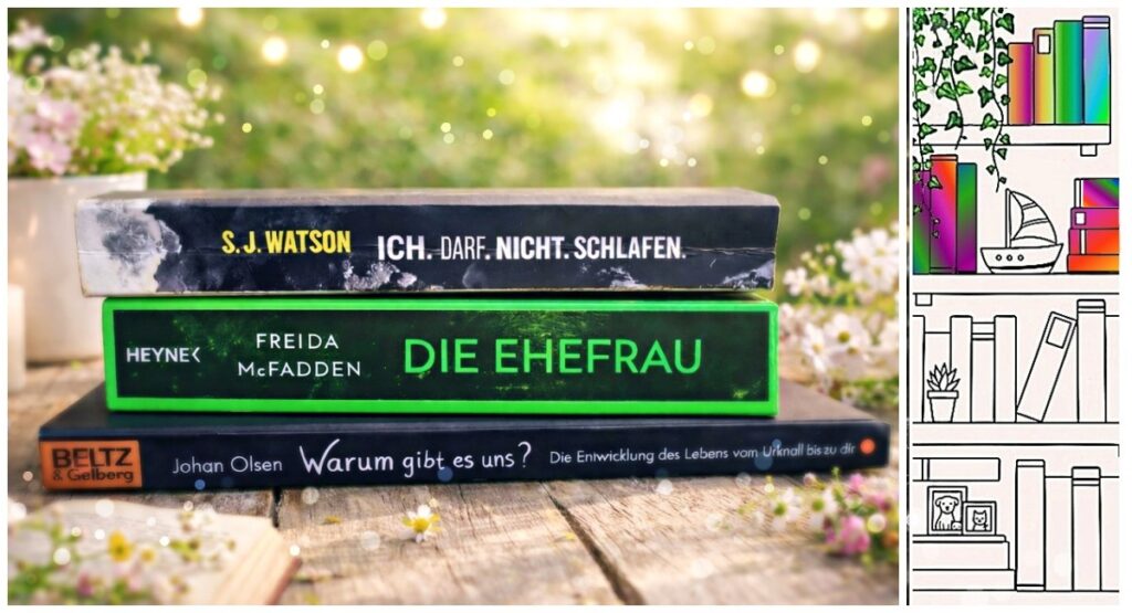 Bis Buch Nummer 11! Ja, wirklich! Ich habe im April ganze fünf Bücher beendet – allerdings nur, weil ich „Hinter diesen Türen“ aus dem Vormonat im März doch noch – bis auf die letzten paar Seiten – verschlingen konnte. Danach hatte ich mich voll und ganz auf „Wolf Lake“ konzentriert – den fünften Band der Dave-Gurney-Reihe, den ich schon seit Ende Februar immer mal wieder zur Hand genommen hatte. Und als dieses Rätsel – endlich – gelöst war, griff ich mal wieder nach meinem mittlerweile enorm großen Bücherschrank-Stapel und wählte davon ein Buch („Ich. Darf. Nicht. Schlafen“), das ich aber kurz für „Die Ehefrau“ und „Warum gibt es uns?“ unterbrochen hatte. Hihi, das war die grobe Zusammenfassung meines Lesemonats – und jetzt kommen noch ein paar Infos zu den einzelnen Büchern: