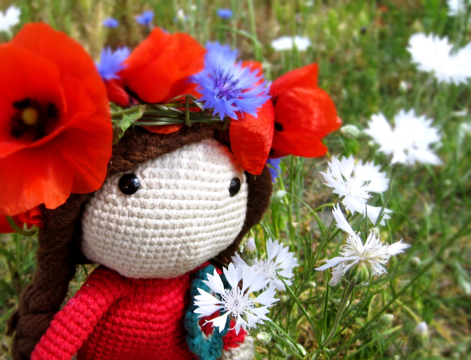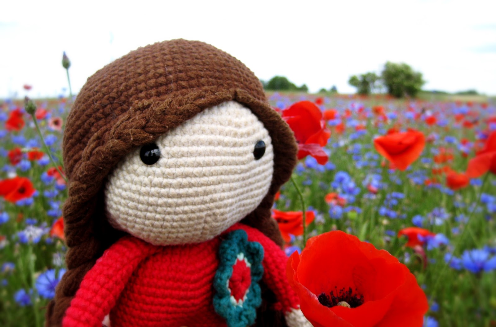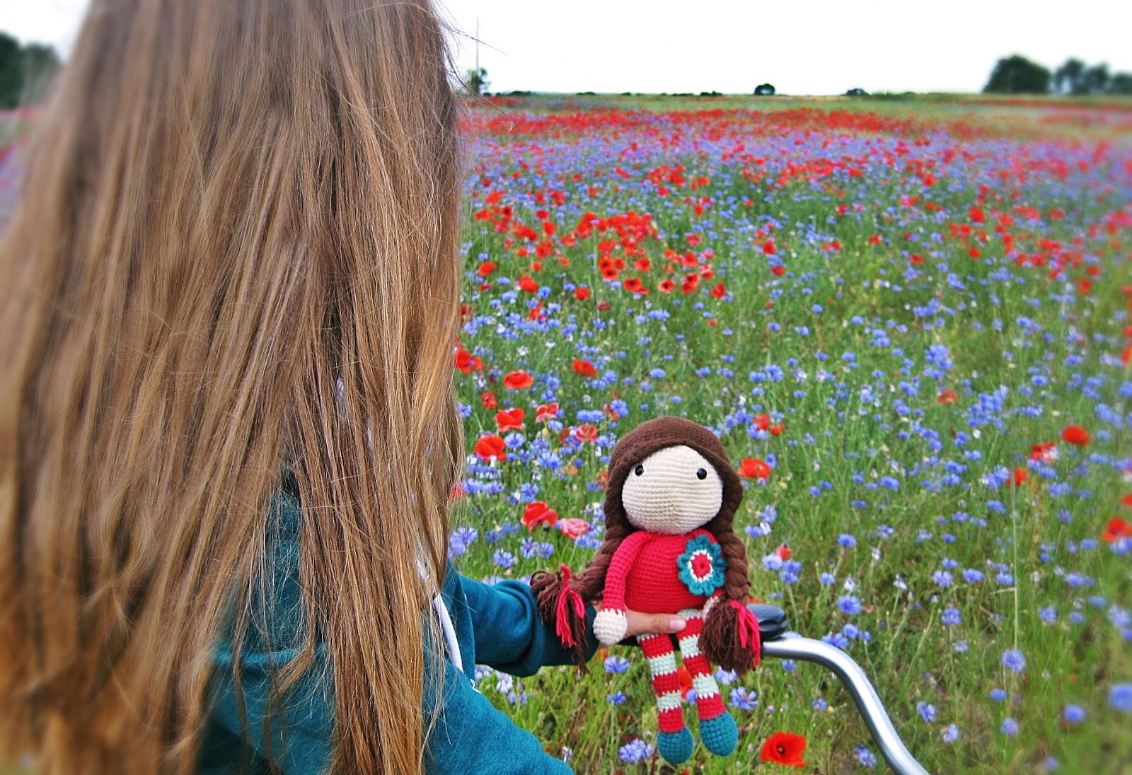 schön, dass Ihr wieder vorbeischaut! Heute möchten wir Euch nämlich ein „altes“ Mitglied unserer Familie vorstellen! Die kleine Mackenzie! Woher sie diesen Namen hat und wer Aimee dazu inspirierte, weiß ich schon gar nicht mehr, aber Klein Mackenzie lebt schon seit über zwei Jahren unter unserem Dach! Sie ist auch das allererste Püppchen, das ich je gehäkelt habe. Die Kleine entstand im Februar 2013 nach einer Häkelanleitung, die ich damals im Internet fand und kaufte. Letzte Woche haben wir sie mit auf eine Fahrradtour genommen und dabei ein herrlich buntes Blumenfeld entdeckt! An dem Nachmittag sind die folgenden Bilder entstanden: