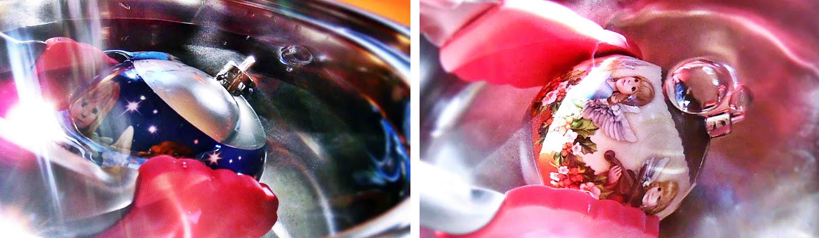 Das heiße Wasser lässt die Folie schrumpfen und sich dabei an das Glas, die Kugel oder was auch immer man damit verschönern möchte, anschmiegen. Der Gegenstand sollte jedoch eine glatte Oberfläche haben. Umso schöner ist danach das Ergebnis!